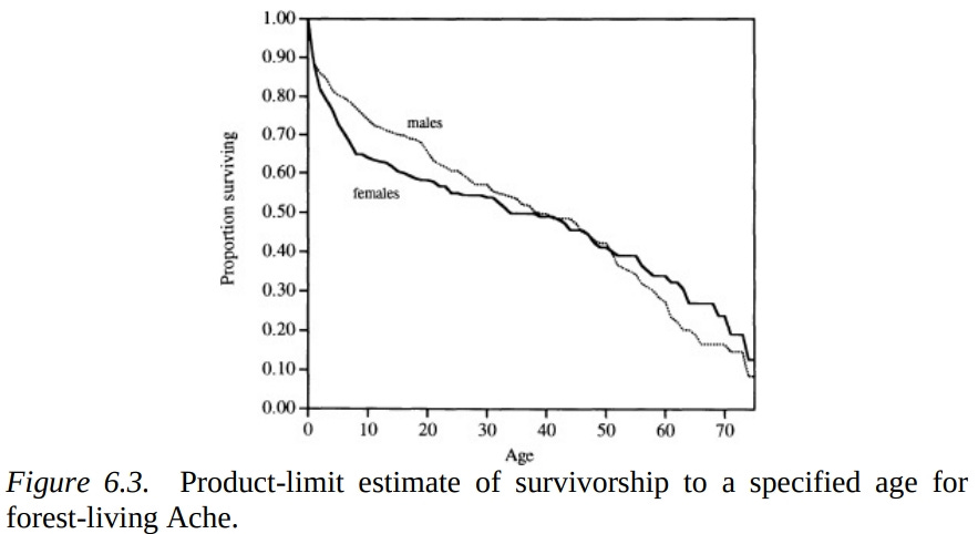 Above is a graph from Aché Life History (1996) by Kim Hill and Magdalena Hurtado, showing survival rates at different ages for Aché males and females from the time when they lived as hunter-gatherers. Females are much more in danger during their first years of life. Then males start dying at higher rates in their late teens. Around age 40, the number of females exceeds the number of males due to the high mortality of males in their prime.