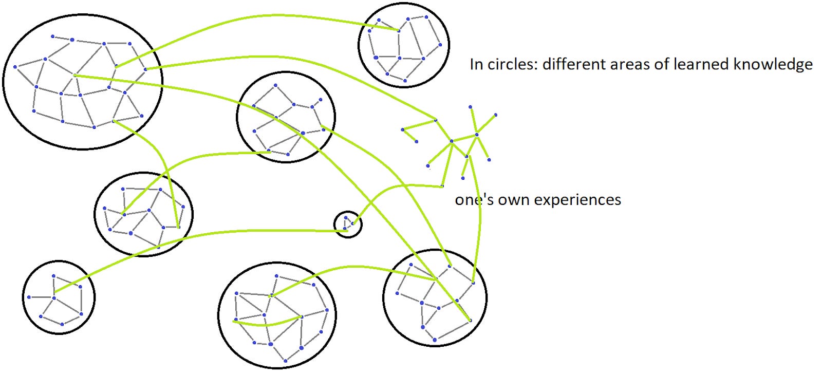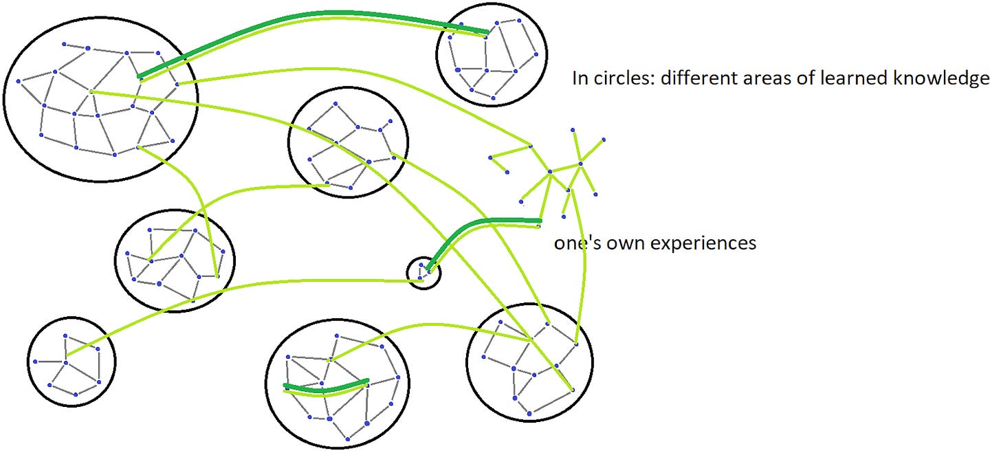 The light green lines are spontaneous connections between concepts. The striped lines of light green and dark green are connections between concepts that are tried, tested and deliberately thought over. Intelligent people do not only possess the ability to create new connections between concepts. They also know how to select between those connections. They spend a lot of effort to find out which are good, which are bad, which do only sound funny?