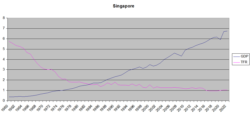 About the same thing happened in Singapore and South Korea, but a little later. Fertility plummeted to Western levels during only one generation, while the economy was still of modest size.